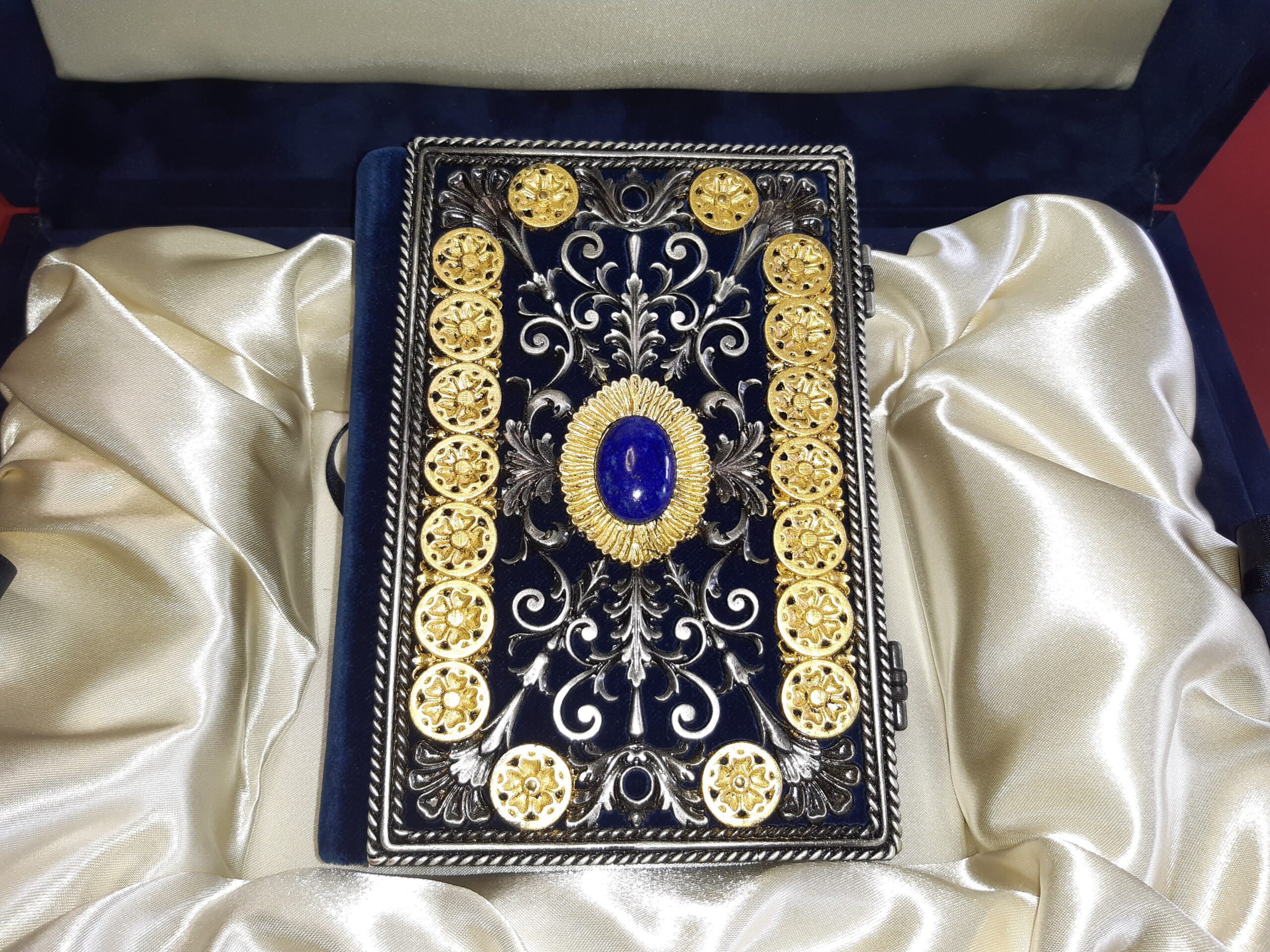 | Materiale: | Lapislazzuli Naturale Incastonato Nel Piatto Anteriore, Piatti In Lamina Dorata E Argentata, Velluto Di Seta Blu |